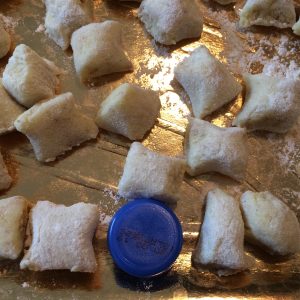 Quindi ci teniamo l’impasto appiccicoso e ovviamo al problema mettendo più farina nella spianatoia mentre formiamo gli gnocchi.