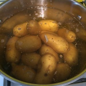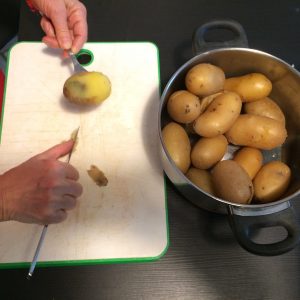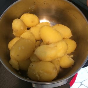 Si parte quindi proprio dalle patate. Noi avevamo in casa quelle comprate nelle campagne pavesi. Sicuramente genuine ma un po’ troppo piccole. Consiglio: utilizzate delle patate di media grandezza. Si fanno bollire in abbondante acqua non salata, perchè vanno fatte bollire con la buccia e quindi il sale non penetrerebbe comunque.