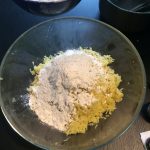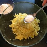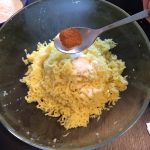 Ora aggiungiamo la farina. Poca, circa il 10% del peso delle patate, noi siamo partiti da 150 g e ne abbiamo aggiunto poi un altro po’. Aggiungiamo un cucchiaino di sale e di noce moscata. Claudio consiglia di metterci anche la curcuma, ma non l’avevamo, da un piacevole colore giallo allo gnocco e fa tanto bene!