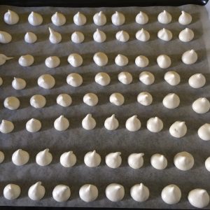 La preparazione é molto semplice: iniziate a montare gli albumi, quando inizieranno a diventare schiumosi si aggiunge un terzo dello zucchero e si continua a montarli aggiungendo lo zucchero piano piano e le gocce di limone. Mettiamo il composto in una sache a poche e formiamo le meringhe della dimensione desiderata. Noi le abbiamo fatte piccolissime per decorare una torta, guarda qui!