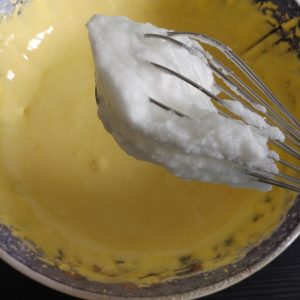 Versiamo un po’ di albumi sulla crema di tuorli per ammorbidirla mescolando con movimenti dolci dal basso verso l’alto di modo che gli albumi non si smontino. Versiamo il resto degli albumi.