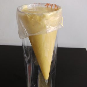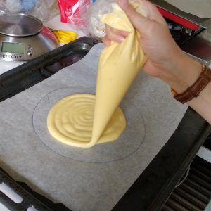 Mettiamo il composto in una sac a poche e versiamolo a girare sul nostro foglio di carta da forno. Partendo dal centro, fino a raggiungere la dimensione desiderata.