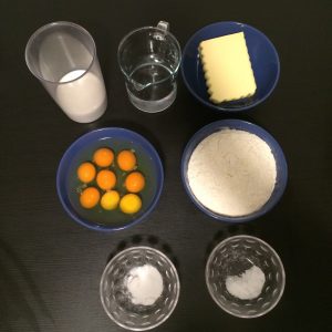 200 g di burro, 300 g di acqua, 200 g di latte, 6 g di sale, 10 g di zucchero, 300 g di farina bianca 00, 480 g di uova. Con il senno di poi le uova sono veramente tante! Siamo arrivati a 8 uova, 450 g, e ci siamo fermati… il bigné vuoto aveva uno spiacevole gusto di frittatina che poi tra il ripieno e la ganache a cioccolato è sparito, ma forse tornando indietro rivedremmo le dosi della uova. Intanto ve la raccontiamo per come l’abbiamo fatta, con difficoltà ed errori!
