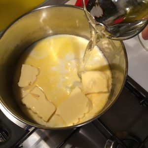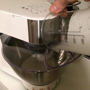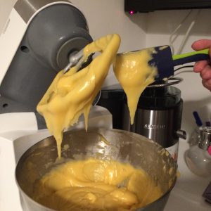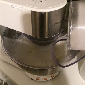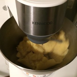 Si inizia mettendo in un pentolino burro, acqua, latte, zucchero, sale e si fa bollire. Intanto setacciamo la farina. Appena bolle bisogna aggiungere la farina, mischiando bene per evitare grumi. Si crea la cosiddetta “polenta”. L’impasto si stacca dai bordi e lascia una patina bianca. E qui il bivio: se siete delle persone fortunate come noi versate l’impasto nella ciotola della planetaria e la fate andare con la frusta K fino a che non si raffredda… altrimenti tanto olio di gomito per girare e girare a mano. La prima volta Amedeo l’ha fatto così… ecco perchè abbiamo preso la planetaria e non la tv per la sala 🙂