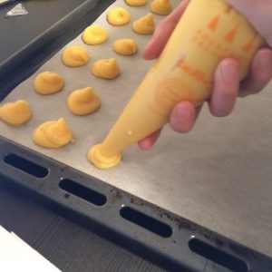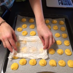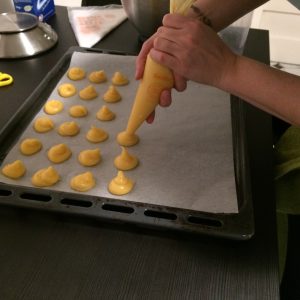 Ora riempite la saccapoche e su un foglio di carta da forno (purtroppo non abbiamo il foglio di silicone con i buchi di cui parla il maestro nel video) fate dei piccoli bigné, un diametro di circa 4/5 cm. Bisogna tenere ferma la saccapoche e stringere, non fare dei ricciolini, alla fine tirare sù, non importa se c’è il ciuffetto, poi lo potete appiattire con le dita. Mantenete una certa distanza tra di loro… in cottura crescono tanto!