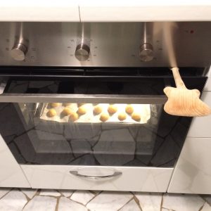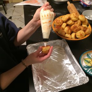 Altro segreto del maestro: tenete il forno leggermente aperto, lui suggerisce di mettere una pallina di carta stagnola, noi abbiamo optato per un mestolo. ATTENZIONE: fate quest’operazione dall’inizio, se aprite il forno a metà i bignè si ammosciano. In questo caso chiudete il forno totalmente e si riprendono… Per fortuna i bigné sono tanti e avrete occasione di fare più infornate per ottimizzare il metodo di cottura e impratichirvi con la saccapoche.