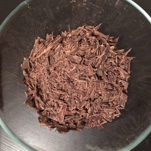 Pochissimi ingredienti: 300 g di cioccolato fondente tagliato a coltello sottile e 220 g di panna. Si fa bollire la panna e si versa sul cioccolato, si mescola bene con una frusta fino ad ottenere una ganache bella lucida.