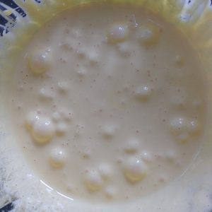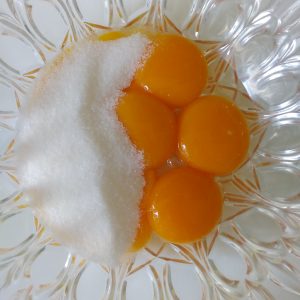 Lavoriamo i tuorli con l’altra metà dello zucchero (50g) fino ad ottenere un composto bello gonfio e chiaro.
