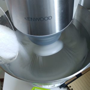Iniziamo a montare a neve ferma gli albumi, quando sono quasi montati aggiungiamo metà dello zucchero (50g) e continuiamo a montare per bene.