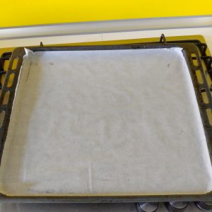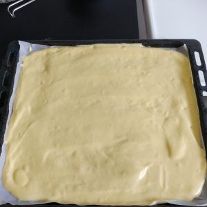 Imburriamo i bordi della laccarda del forno e foderiamola con della carta da forno. Riscaldiamo il forno a 200°. Versiamo il composto avendo cura di distribuirlo uniformemente e su tutta la superficie.