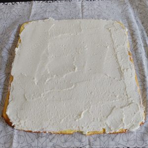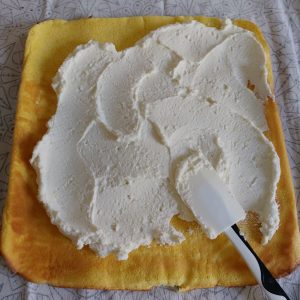 Una volta che il rotolo si sarà raffreddato srotolatelo per bene e stende tutta la ricotta fino ai bordi.