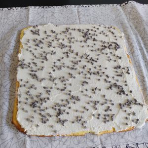 Ricoprite con tante gocce di cioccolato a volontà. Aiutandovi sempre con il canovaccio arrotolate nuovamente il composto il più stretto possibile.