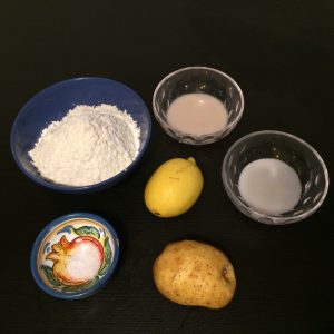 Mischiamo tutti gli ingredienti nella planetaria (all’inizio usiamo la frusta K e poi il gancio): patata, farina, il lievito con l’acqua dove l’abbiamo fatto sciogliere, il sale, lo zucchero e la metà della buccia grattugiata del limone.