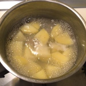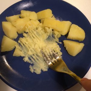 Le patate bisognerebbe farle bollire con la buccia, ma siccome è solo 1 patata abbiamo preferito tagliarla in pezzi per non dover aspettare i canonici 20 minuti di cottura… appena la forchetta le buca sono pronte, ci vogliono max 10 minuti. Le patate vanno schiacciate per bene, non abbiamo lo schiaccia patate, una forchetta è sufficiente.