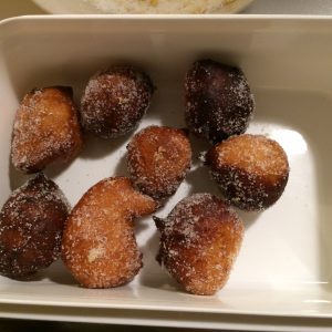 Fate sgocciolare gli sfinci su dello scottex per qualche secondo per togliere l’olio in eccesso e poi fateli rotolare in un mix di zucchero, la restate buccia grattugiata del limone e cannella.