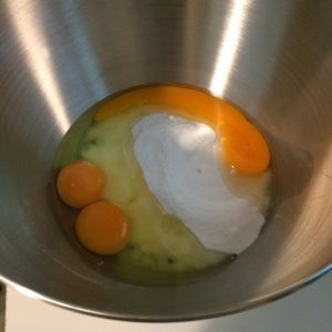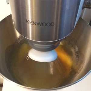 Abbiamo messo nella ciotola della planetaria lo zucchero con le uova e fatto andare per 10 minuti con la frusta a filo, fino a che non sará diventato spumoso e chiaro.