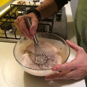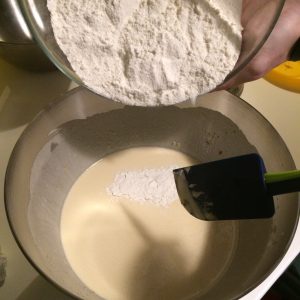 Setacciamo le farine e il lievito e incorporiamo a mano poco alla volta al composto con dei movimenti dal basso verso l’alto, facciamo attenzione a non formare dei grumi.