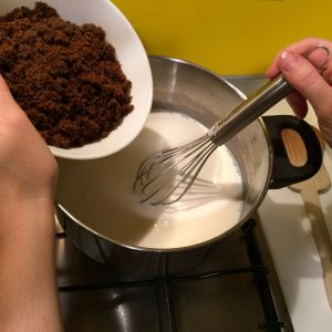 Abbiamo ottenuto una crema molto densa che mettiamo a raffreddare coperta con una pellicola a contatto. Non ci siamo dimenticati del cioccolato! Dobbiamo ridurlo in scaglie e tenerlo da parte.
