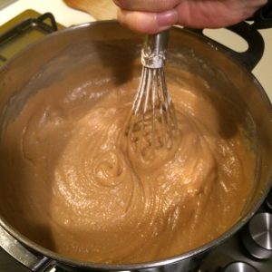 Setacciamo le farine e li mescoliamo con una frusta al latte, evitando di formare grumi. Mettiamo il tutto in un pentolino, aggiungiamo lo zucchero e scaldiamo… quando sta per bollire si aggiunge la pasta di pistacchi che deve essere prima ammorbidita con una forchetta.