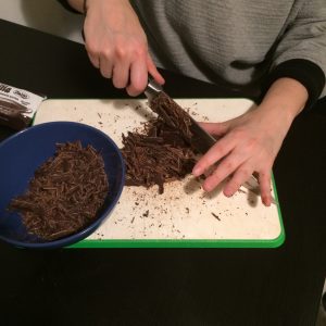 Non ci resta che preparare la nostra ganache al cioccolato! Tagliamo il cioccolato con il coltello e lo mettiamo in un contenitore capiente.