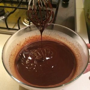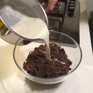 In un pentolino portiamo quasi a ebollizione la panna e la versiamo sul cioccolato. Giriamo velocemnte con una frusta fino ad ottenere una ganache liscia e bella lucida.