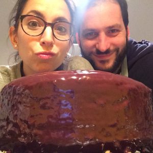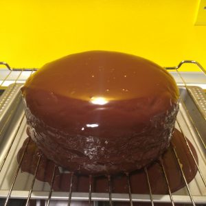Trasferiamo con molta attenzione la nostra torta sulla griglia del forno e chiudiamo con la crema gli eventuali buchi laterali. Mettiamo una taglia sotto la grigia per raccogliere la ganache in eccesso e versiamo la ganache a 32° fino a ricoprire completamente la torta. Amedeo adora questo momento!