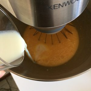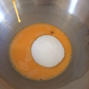 Iniziamo sbattendo le uova in planetaria, facciamole andare un po’ e aggiungiamo lo zucchero.