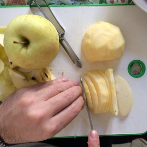 Intanto sbucciamo le mele. Due andranno tagliate a fettine sottili sottili, una in pezzetti piú corti e cicciotti.