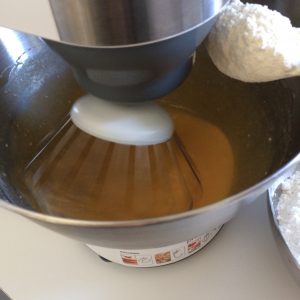 Mischiamo il lievito con la farina e settaciamo. Aggiungiamo le polveri poco a poco.