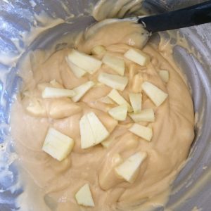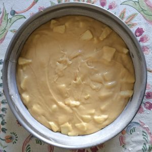 Mischiamo i pezzetti di mela all’impasto mischiando per bene e versiamo il composto in uno stampo ben imburrato e infarinato (ne abbiamo usato uno da 28 cm).