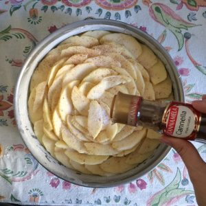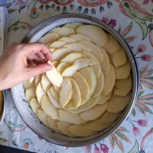Ricopriamo il tutto con le fettine sottili di mele decorando a girare… non abbiate paura di mettere tante mele, é la parte piú buona della torta.