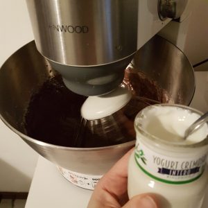 Versare l’olio, la farina setacciata, il cacao, il lievito e lo yogurt alternando gli ingredienti.